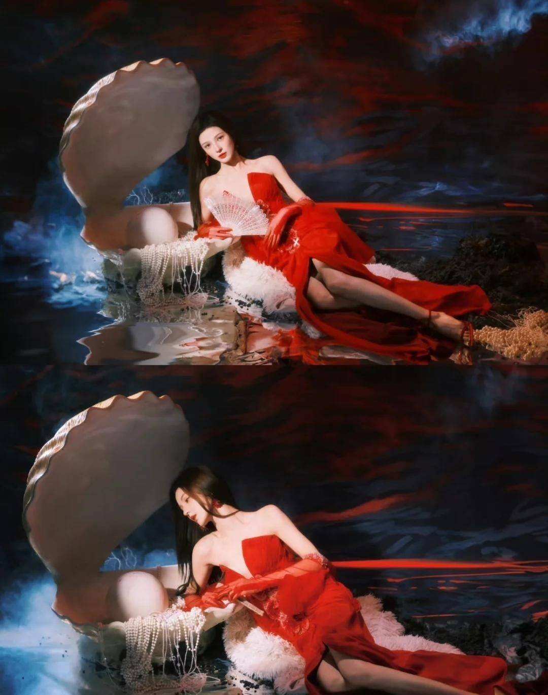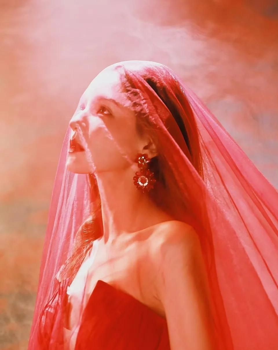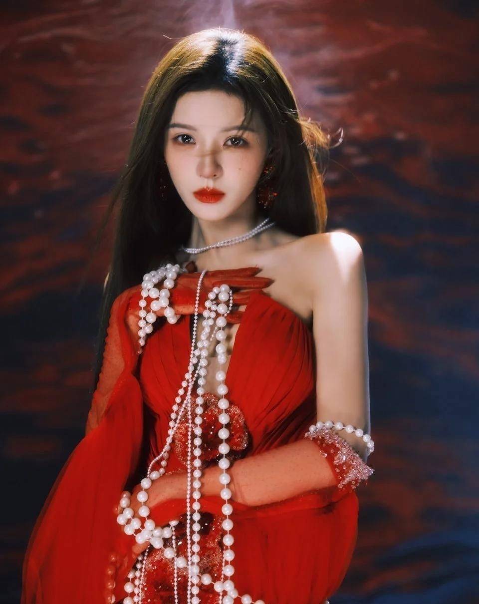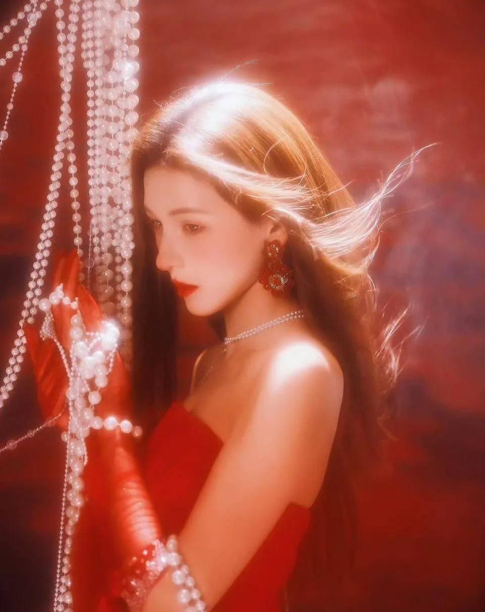 她以一袭红色薄纱长裙惊艳全场,搭配精致珍珠配饰,宛若古典画卷中走出的仕女,美得令人窒息。