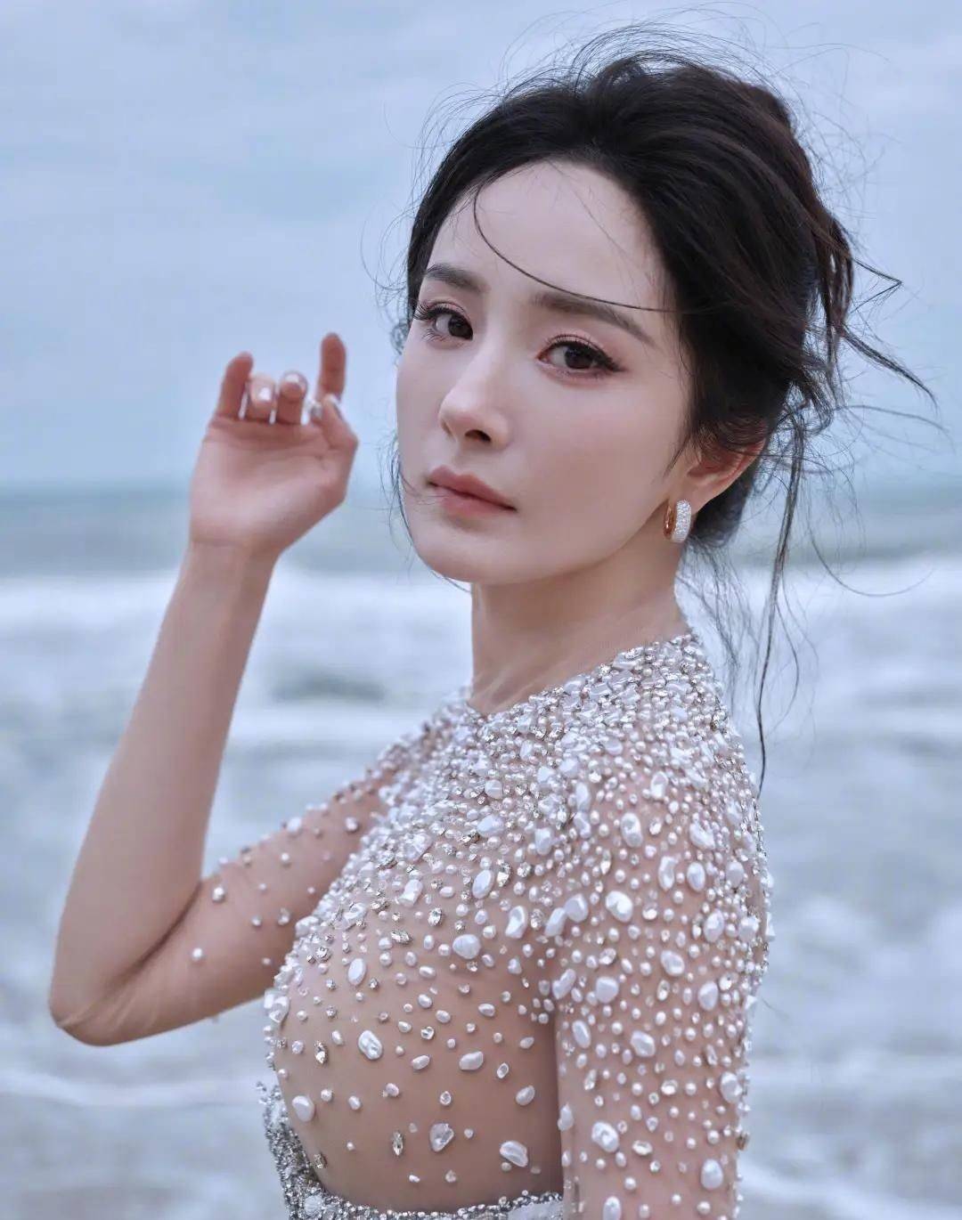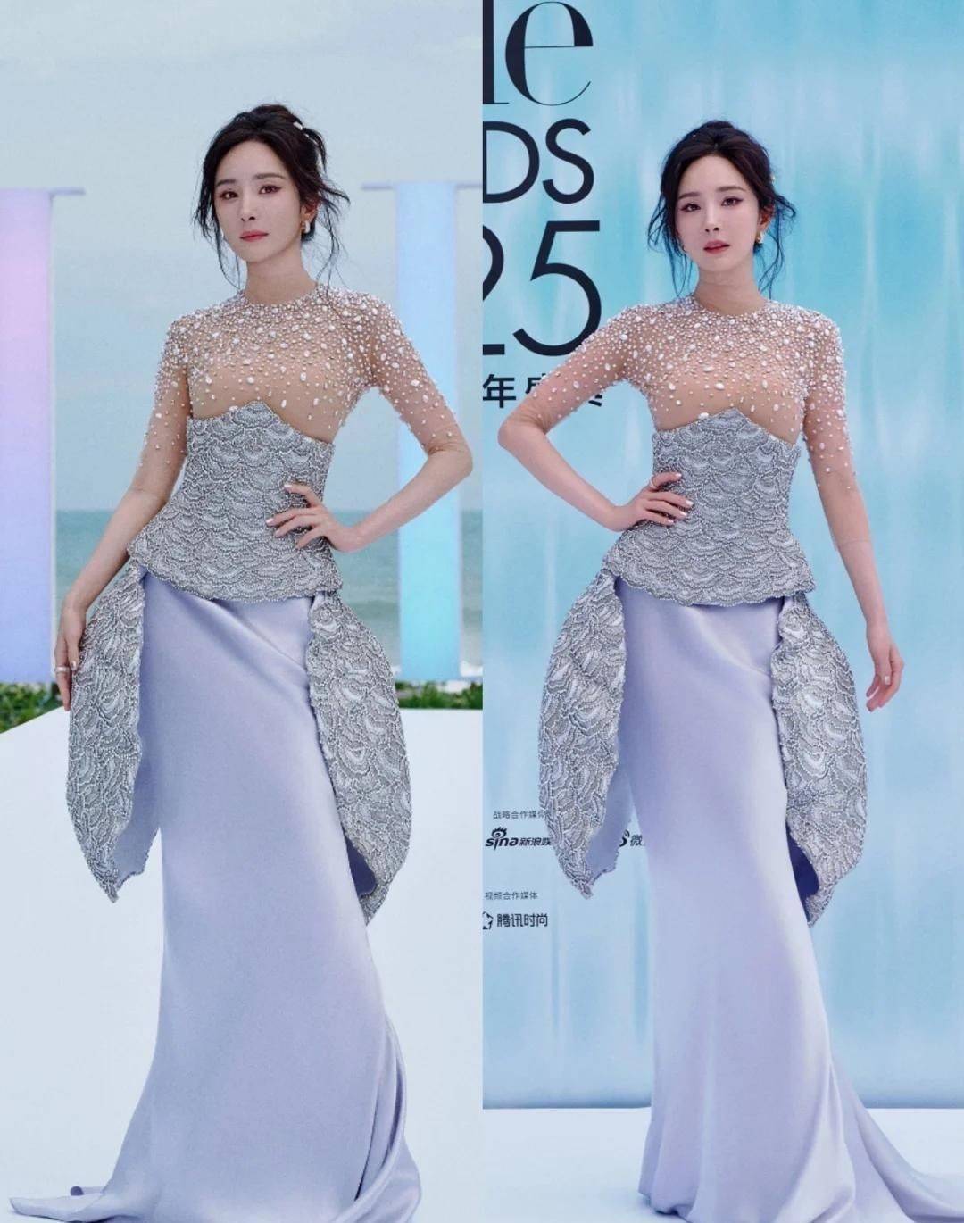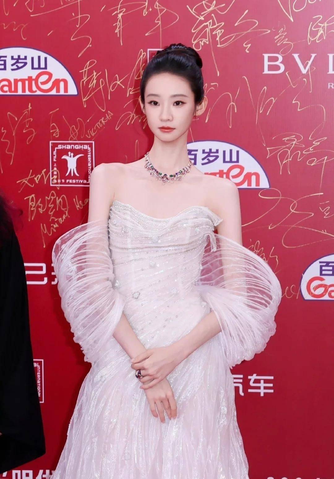 她以一袭红色薄纱长裙惊艳全场,搭配精致珍珠配饰,宛若古典画卷中走出的仕女,美得令人窒息。