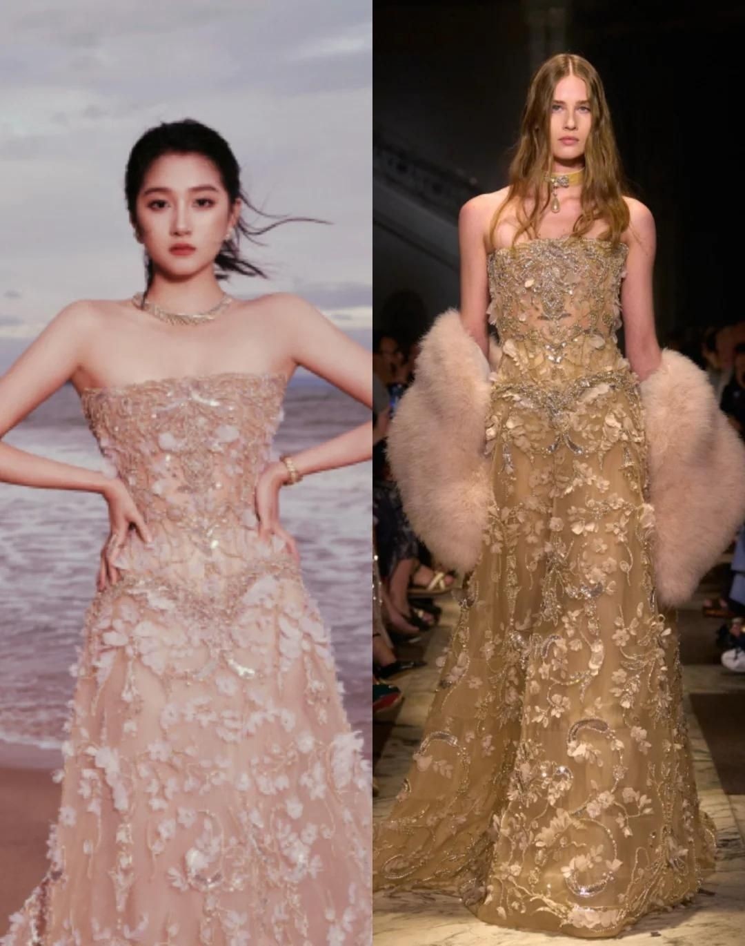 尤其对比专业模特演绎同款时的状态,关晓彤的整体呈现少了高级感,反而透出几分影楼写真的既视感。