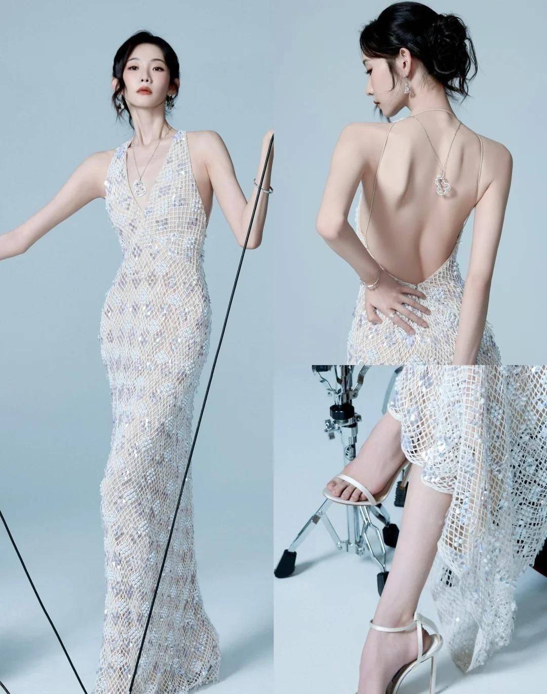 尤其是上半身采用肤色透视网纱材质,远看几乎如同未着寸缕,点缀其间的璀璨珍珠更是吸睛至极,视觉冲击力拉满。