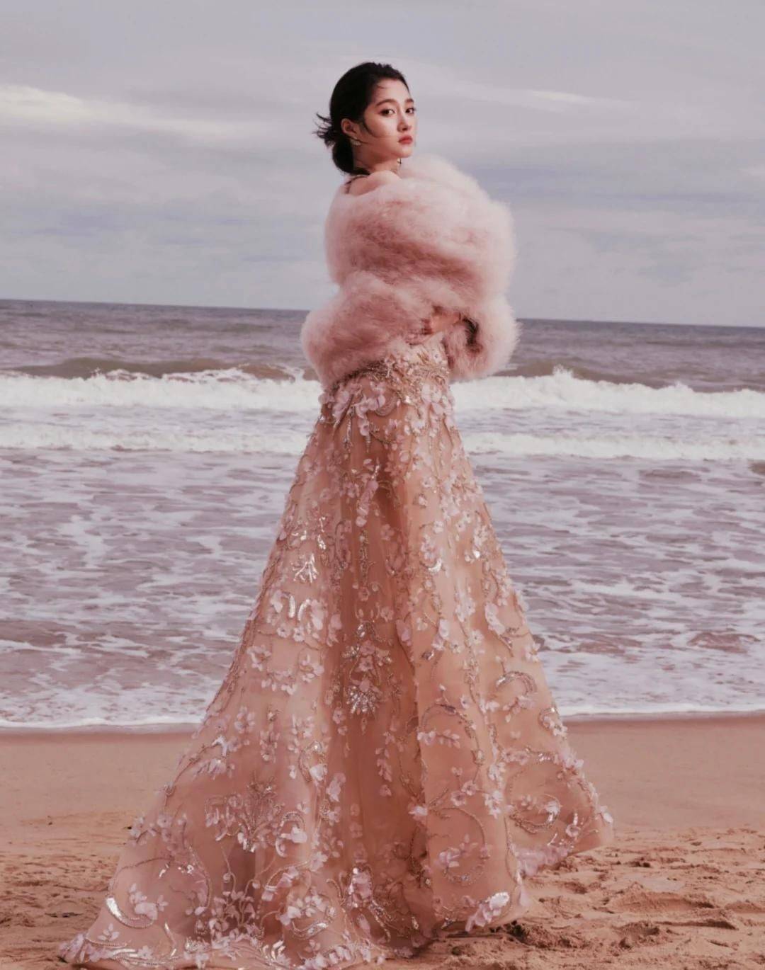 她选择了一条香槟色蕾丝长裙,原本意图走温婉优雅路线,却不料遭到大量网友吐槽“土味十足”。