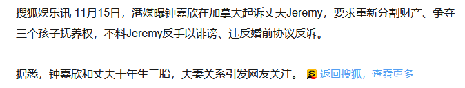 报道中提到,钟嘉欣正在起诉丈夫,要求将两人的财产重新分割。