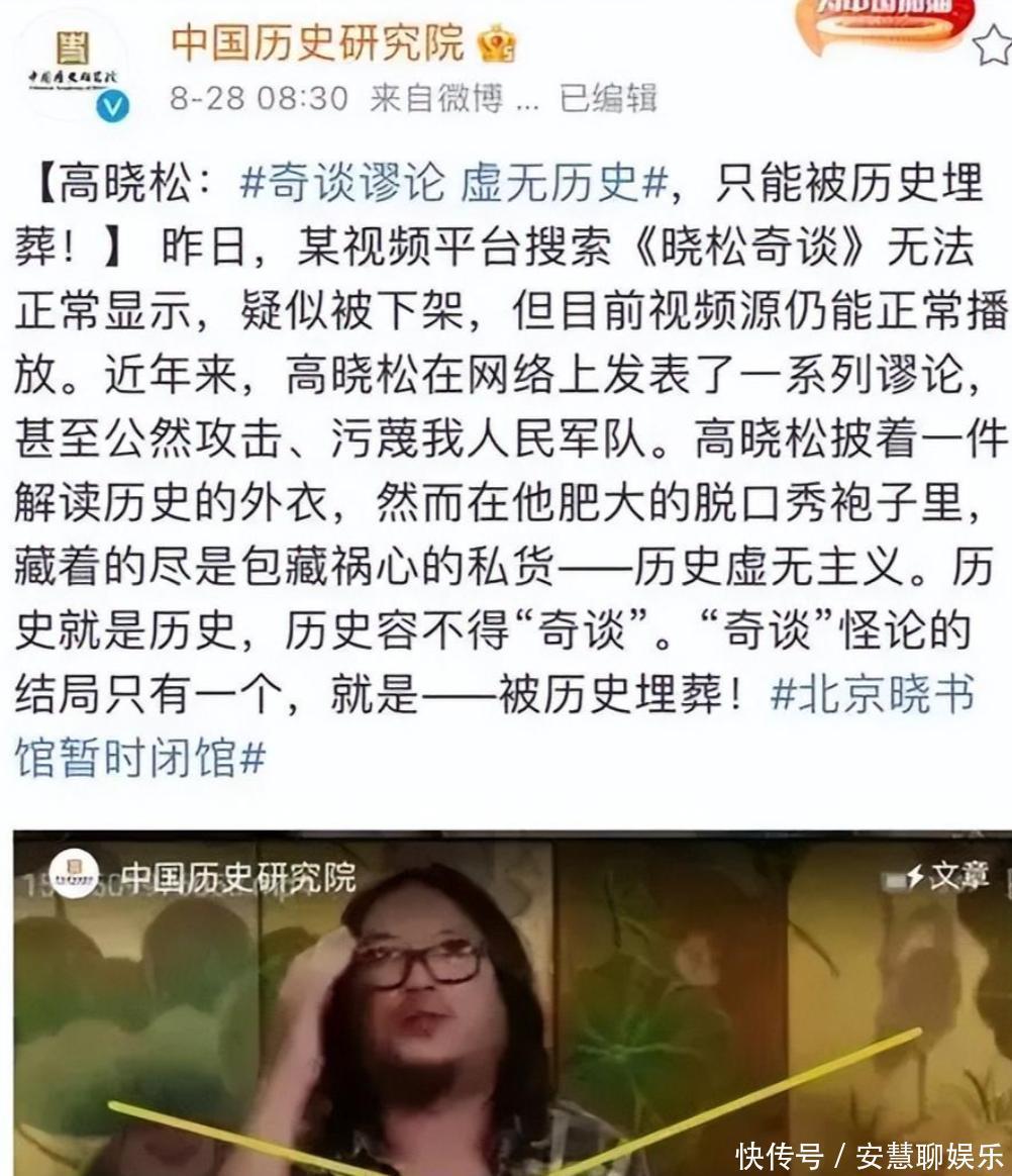 2021月,中国历史研究院点名批评高晓松,指出他的言论严重歪曲历史、伤害民族感情。随后他的微博被封禁,所有节目全部下架,他也从阿里音乐等职位上离职。