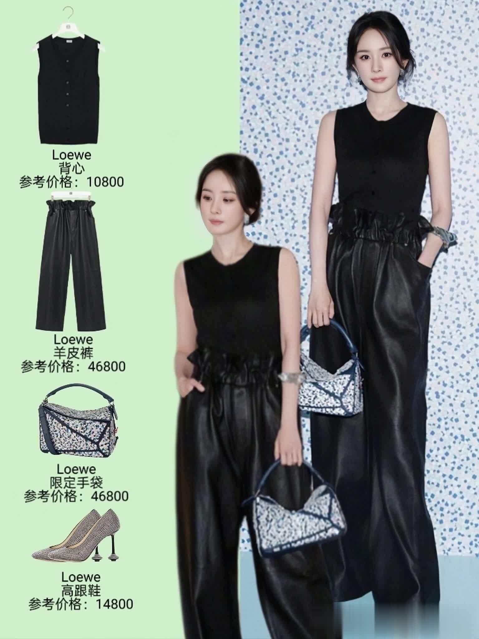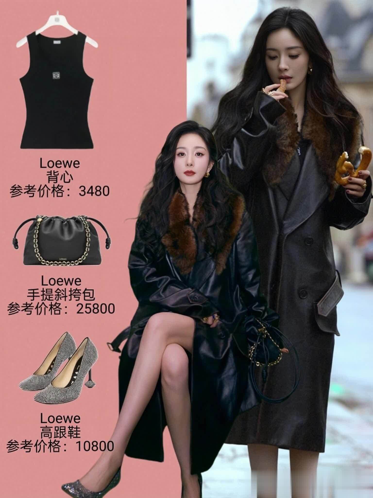 黑色皮风衣太绝了,长度到小腿,廓形设计藏肉一绝,毛领是棕咖色皮草,质感拉满,一看就很贵!里面搭黑色背心,简约又高级,下半身应该是同色系短裙(毕竟大幂幂的腿得露出来?。?#33050上踩那双水钻高跟鞋,闪到不行,走在路上都像自带聚光灯,去看秀或者参加活动穿这套,气场直接两米八,被夸“姐就是女王”~