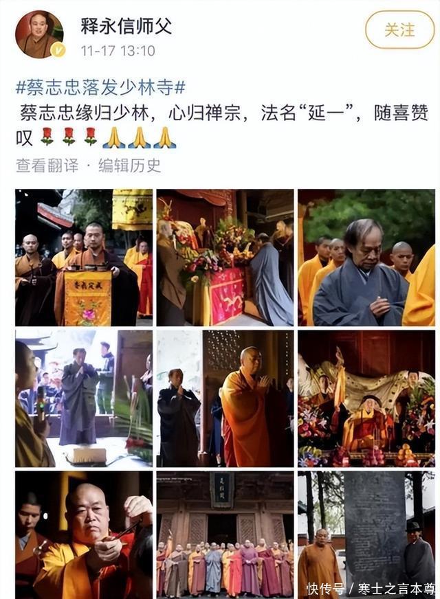 ?????? 在前几年的时候,70多的蔡志忠身着一身僧衣在少林寺中完成了剃度仪式。?????? 当时由少林寺方丈释永信来主持这场仪式。