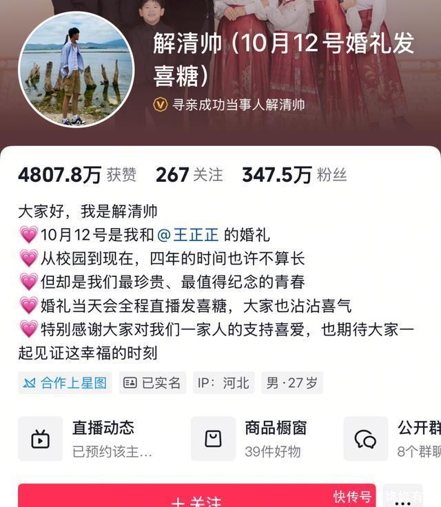 ?????? 全程直播+发放福袋?????? 解清帅官宣婚期引热议?????? 2023年底,河北“千万富翁”解克锋找回丢年的儿子解清帅,引发全网聚焦。寻亲成功后,解清帅的每一步动态都始终牵动外界目光。