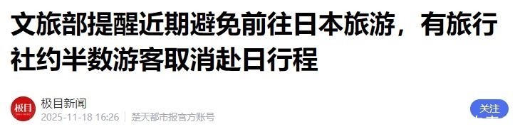 因为就在几天前,日本政客高市早苗公然叫嚣“台湾有事就是日本有事”,挑战着我们的底线,中国外交部第一时间发布了安全提醒,文旅部更是直接建议“近期避免前往”,航空公司的免费退票通道也敞开了大门。