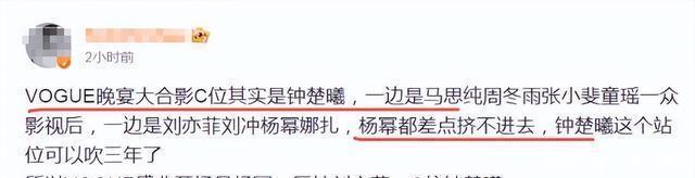 ?????? 本来应该是她和刘亦菲站在C位,可钟楚曦往那一站就占据了很多位置,杨幂和刘亦菲就显得非常拘谨。?????? 有网友还捕捉到,当主编领着刘亦菲进场的时候,眼睛都快把钟楚曦盯穿了。