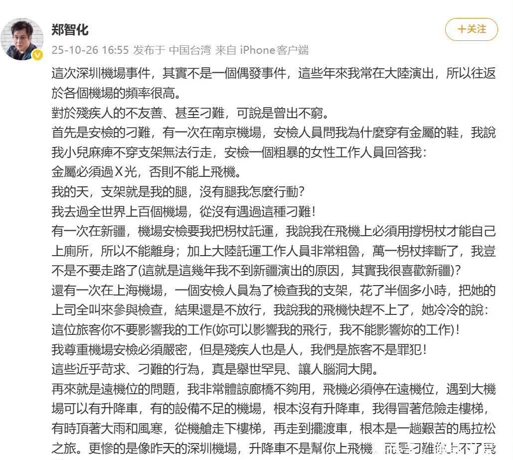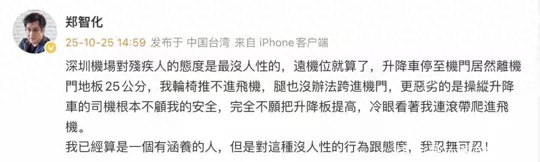 2025号,中国台湾著名歌手郑智化于微博账号发布内容,称深圳机场对待残疾人的态度是最缺乏人情味的。远机位也就罢了,升降车距离飞机地板公分,他自己的轮椅无法推进飞机,腿也没办法跨进去。郑智化还吐槽了操控升降车的司机,对方漠视他的生命安全,看着他狼狈地爬进机舱。郑智化称自己平时很有涵养,可实在无法忍受深圳机场这种冷漠无情的行为与态度。郑智化身为两岸三地极具知名度的老牌歌手,在全国有着数不胜数的歌迷,在全网也有着不计其数的粉丝。