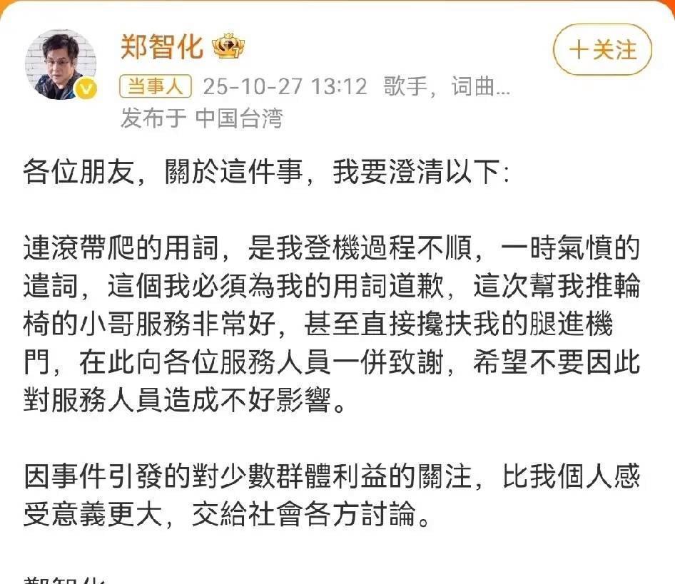 2025日,面对网络上如潮水般的批评与指责,郑智化再度于微博账号发布文章,就自己用词不妥当一事表达歉意,称“连滚带爬”只是一时生气时所用之词。此外,他还特意对帮忙推轮椅的小哥表示了感谢,正是这位小哥扶着郑智化的腿,才使郑智化得以登上飞机。毋庸置疑,郑智化特别强调,期望借由这一事件,能唤起全社会对少数群体权益的重视,让残疾人所面临的艰难处境得以被关注到。尽管郑智化已就该事致歉,但越来越多失去理智的人跑到郑智化的微博账号评论区肆意妄言,致使郑智化账号的评论区彻底失守。