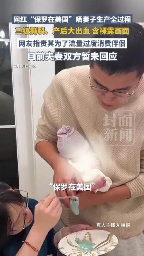 凌晨三点的产房里,保罗的妻子正经历着三级撕裂和大出血的生死考验,3344毫升的失血量几乎抽干了她全身的血液。而此刻,她的丈夫却戴着特制拍摄眼镜,将妻子痛苦扭曲的表情、医生满手鲜血的抢救画面,剪辑成一小时的“生命纪录片”。更讽刺的是,在妻子被推进手术室紧急输血时,视频里突然弹出了某品牌尿不湿的广告——这条被网友称为“人血馒头”的视频,让拥有千万粉丝的网红保罗一夜之间从“宠妻人设”跌落到舆论谷底。
