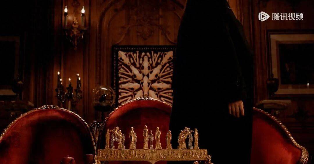如果你细心就会发现,此时林姨背后是一幅白色动物头骨拼凑成的类似殉葬图的巨型画幅。