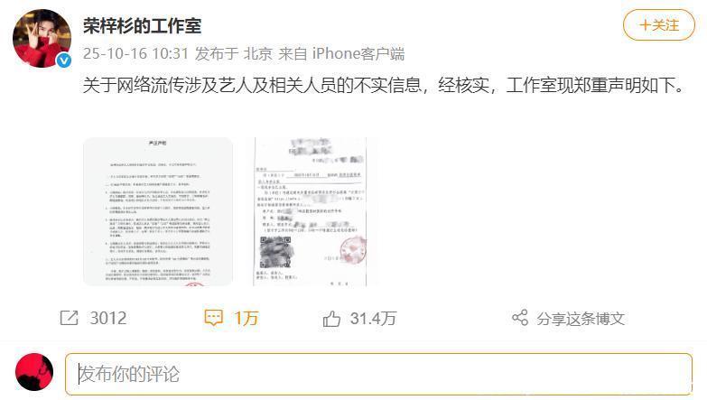 面对舆论热议,10日上午,荣梓杉方面发布了一份声明。