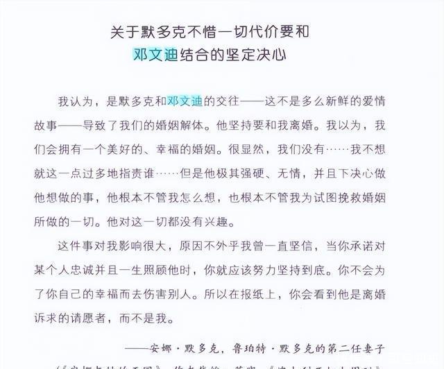 ?????? 2013年初,媒体爆邓文迪和布莱尔关系不一般,两人换多封邮件,甚至传出多次私下见面。布莱尔是他们女儿教父,但默多克起初不信。后来他去澳大利亚出差,听说她在加州卡梅尔农场和布莱尔相处密切。?????? 默多克回来说问员工,确认细节。布莱尔一直否认,但默多克忍不了,6日申请离婚。11日在纽约达成协议,她只分到曼哈顿第五大道一万美元公寓、北京故宫东侧四合院,还有些现金和游艇,但远少于前妻安娜亿美元。?????? 外界同情她吃亏,但这协议聪明,子女继承权没动。离婚后,她没消停,继续社交。2014年巴黎时装周,她和型男设计师现身,媒体又炒。