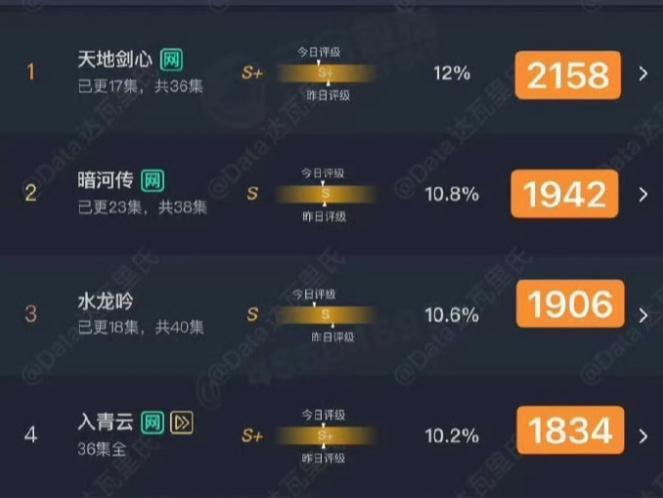 让大家没想到的是,《天地剑心》遇到《暗河传》和《水龙吟》,这三部剧都是“武侠剧”,所以直接被网友们放在一起进行对比,出现三部剧对打的情况,从云合数据上看,《天地剑心》排在第一名,紧随其后的是《暗河传》和《水龙吟》,这三部剧的正片有效占比相差并不大。