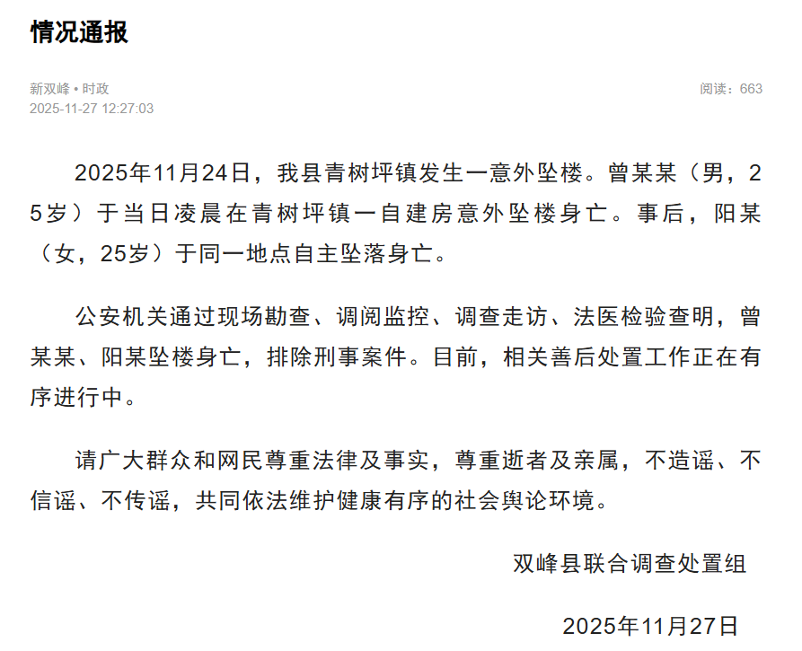 2025日,我县青树坪镇发生一意外坠楼。曾某某(男,25岁)于当日凌晨在青树坪镇一自建房意外坠楼身亡。事后,阳某(女,25岁)于同一地点自主坠落身亡。