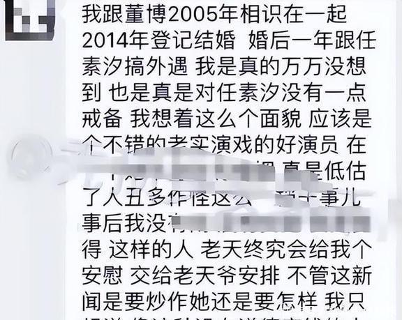 没过多久,董博的前任媳妇儿就跳出来揭露真相,明确说任素汐确实在她的婚姻里搅和得不可开交。