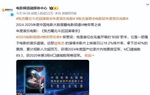 ?????? 终于等来的官方认证?????? 10日那天,《张杰曜北斗巡回演唱会》电影获得"年度音乐电影"荣誉的消息传出来,全网都在恭喜他。?????? 这不是什么营销号炒作,不是粉丝自己吹,而是实打实的央媒发文、高调官宣。?????? 这个荣誉对张杰意味着什么??????? 意味着他从一个备受争议的选秀歌手,变成了被主流认可的艺术家。