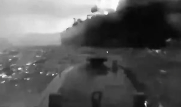 根据SBU发布的袭击视频,装满炸药的乌克兰无人艇高速冲向油轮,随后油轮发生爆炸并起火。