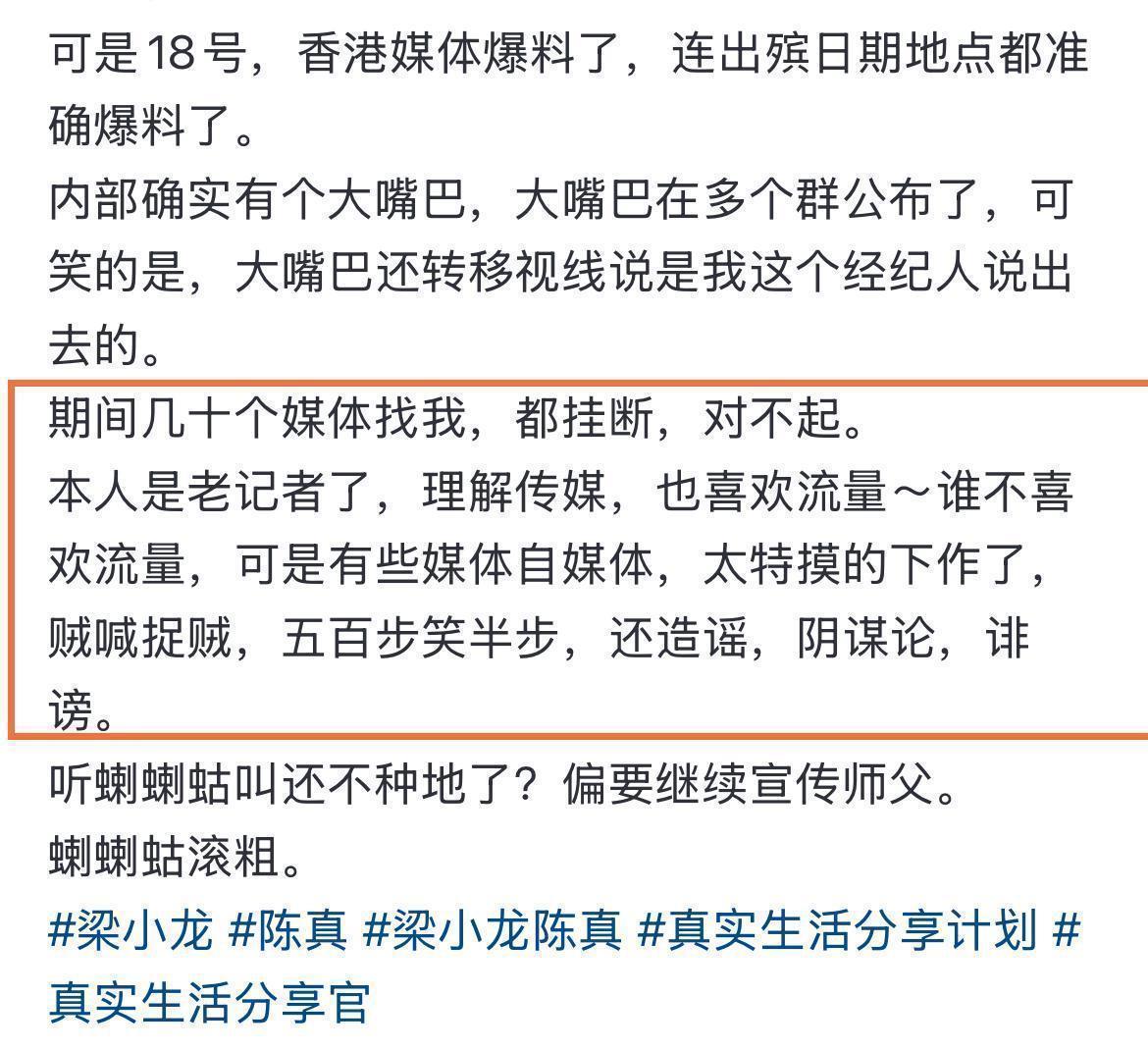 没过多久,管理梁小龙视频账号的“徒弟”就发了一条微博,说本来想低调点,所以弟子们一直都在不断分享视频。紧接着,经纪人又出来说,这个消息之所以被曝光,是因为有内部熟悉情况的人在群聊里泄露的。