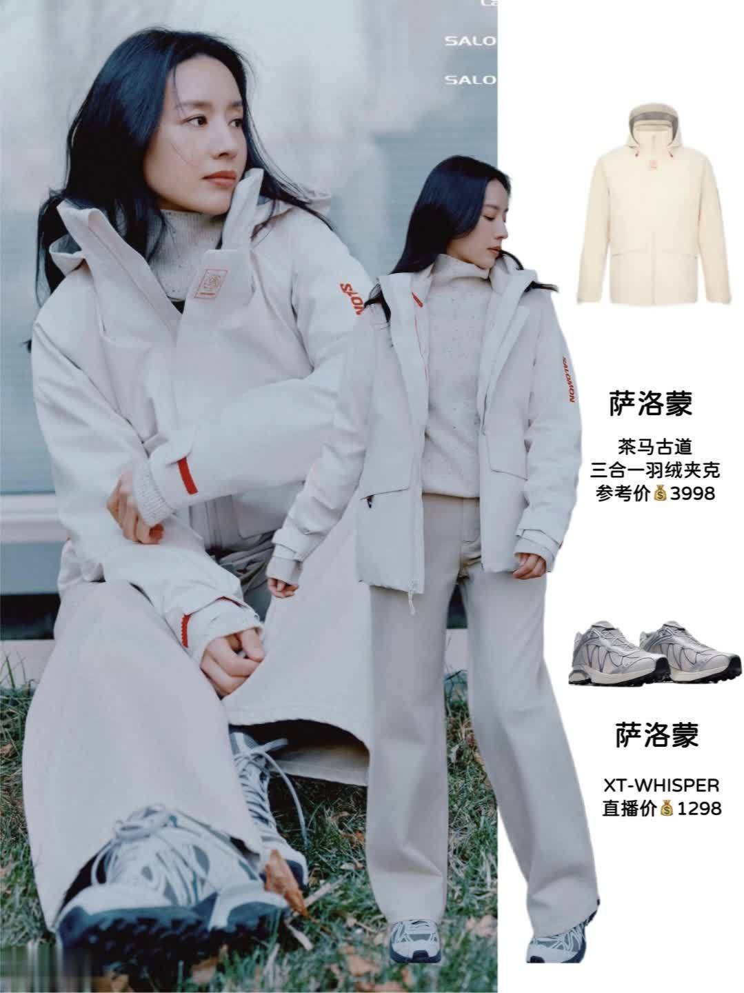 极简户外风 | 萨洛蒙三合一羽绒夹克+同色系长裤,同色系长裤拉长腿部线条,内搭浅灰色高领衫,整体色调统一又高级。