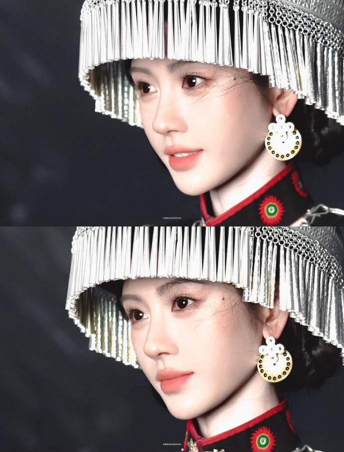 造型中的细节处理尤为亮眼,头饰采用彝族传统纹样设计,搭配流苏元素增添灵动气息,与她的气质相得益彰。服饰的剪裁既保留了民族服饰的经典廓形,又融入了现代设计理念,使得整体造型既庄重又不失活力,展现出对传统文化的创新表达。