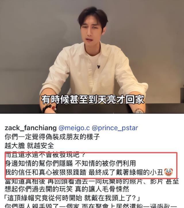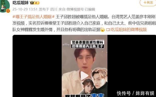 ?????? 邱胜翊插足别人婚姻?????? 10号,演员范姜彦丰发视频骂邱胜翊,?????? 说他勾搭上自己老婆江玮琳,自己成了“戴绿帽的小丑”。