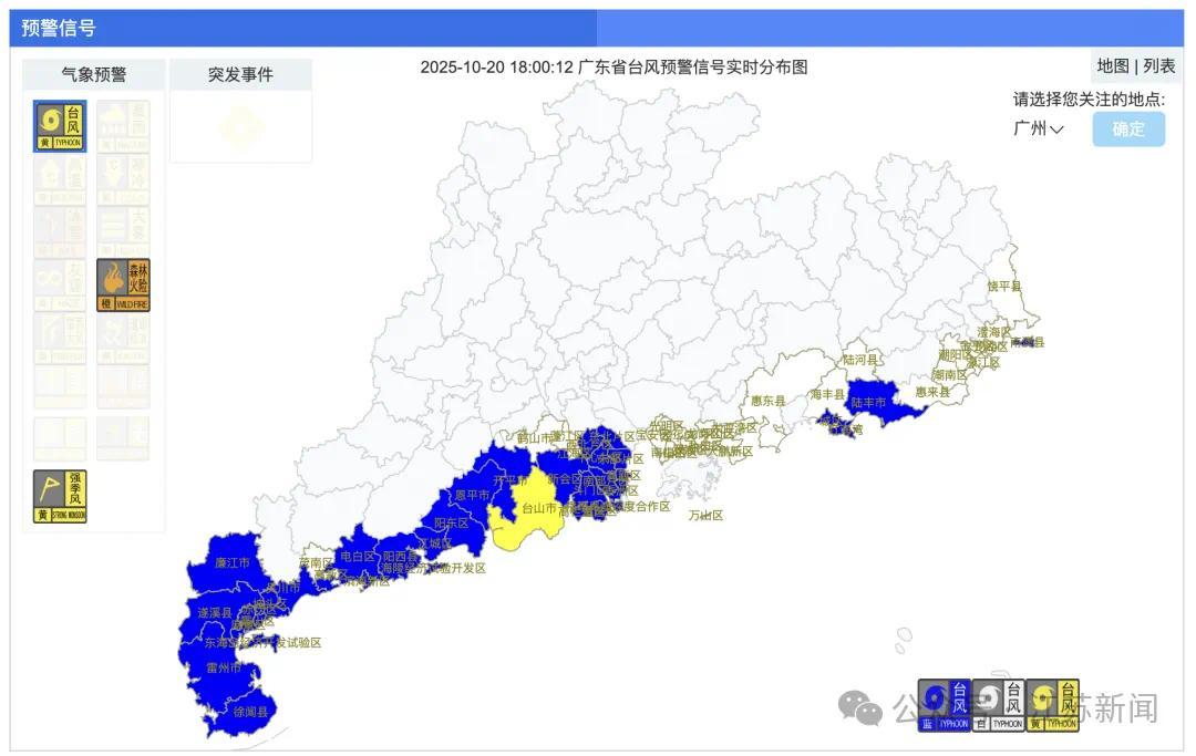 截时,广东台风预警信号发布情况