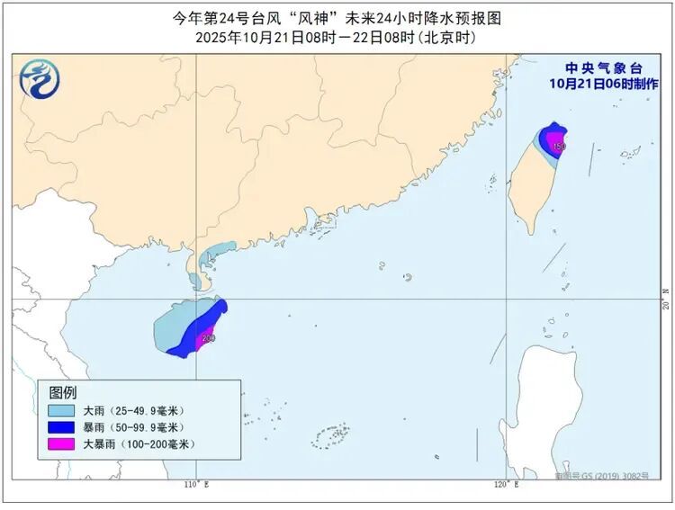 降水预报:21时时,广东西南部、海南岛、台湾岛北部等地有大到暴雨,海南岛东南部、台湾岛北部局地有大暴雨(100毫米)。