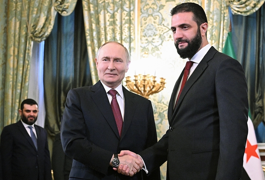 当地时日,俄罗斯莫斯科,俄罗斯总统弗拉基米尔·普京与叙利亚总统艾哈迈德·沙拉在克里姆林宫会晤前握手并合影。视觉中国 图