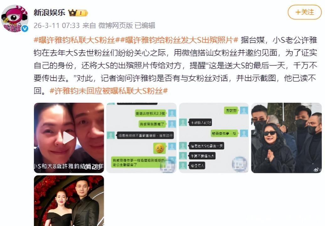 ?????? 这边大S的后事刚尘埃落定,那边小S家里又炸开了锅。3号一大早,网上突然流出猛料,说许雅钧在大S走的那会儿,居然主动去联系大S的女粉丝。为了证明自己没瞎扯,他还甩出了一张从未公开过的现场照片,甚至千叮咛万嘱咐让人别外传,转头又想约人家见面。这操作真是让人看傻了眼。要知道,许雅钧身上的花边新闻早就数不过来了,以前小S在节目里被怼老公夜生活丰富,也就只能笑笑说不介意。可这次不一样,直接牵扯到了刚走的姐姐。记者想去求证,全是“已读不回”,最后还得靠经纪人出来打圆场,说什么“光明正大感谢守护大S的粉丝”。这话听着怎么那么别扭?都被实锤了还谈什么光明正大,难怪小S至今一声不吭,估计心里也是五味杂陈。