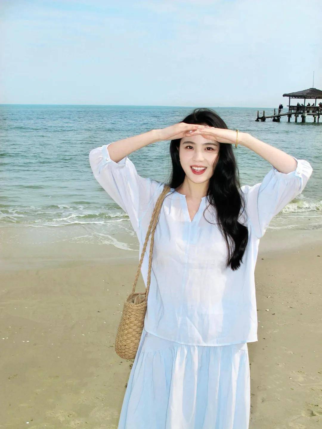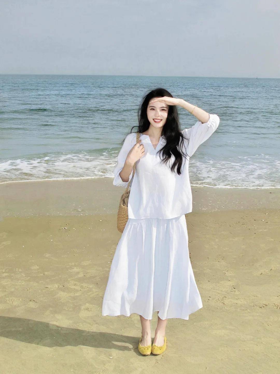 挎着包包正面站立,双脚微微并拢,身体放松,一只手轻轻抬手遮阳,另一只手自然挎包放在身侧,脸上带着微笑,看向镜头。穿裙子拍照用这个小动作,落落大方又温柔,拍出来好看又漂亮,日常拍超合适。