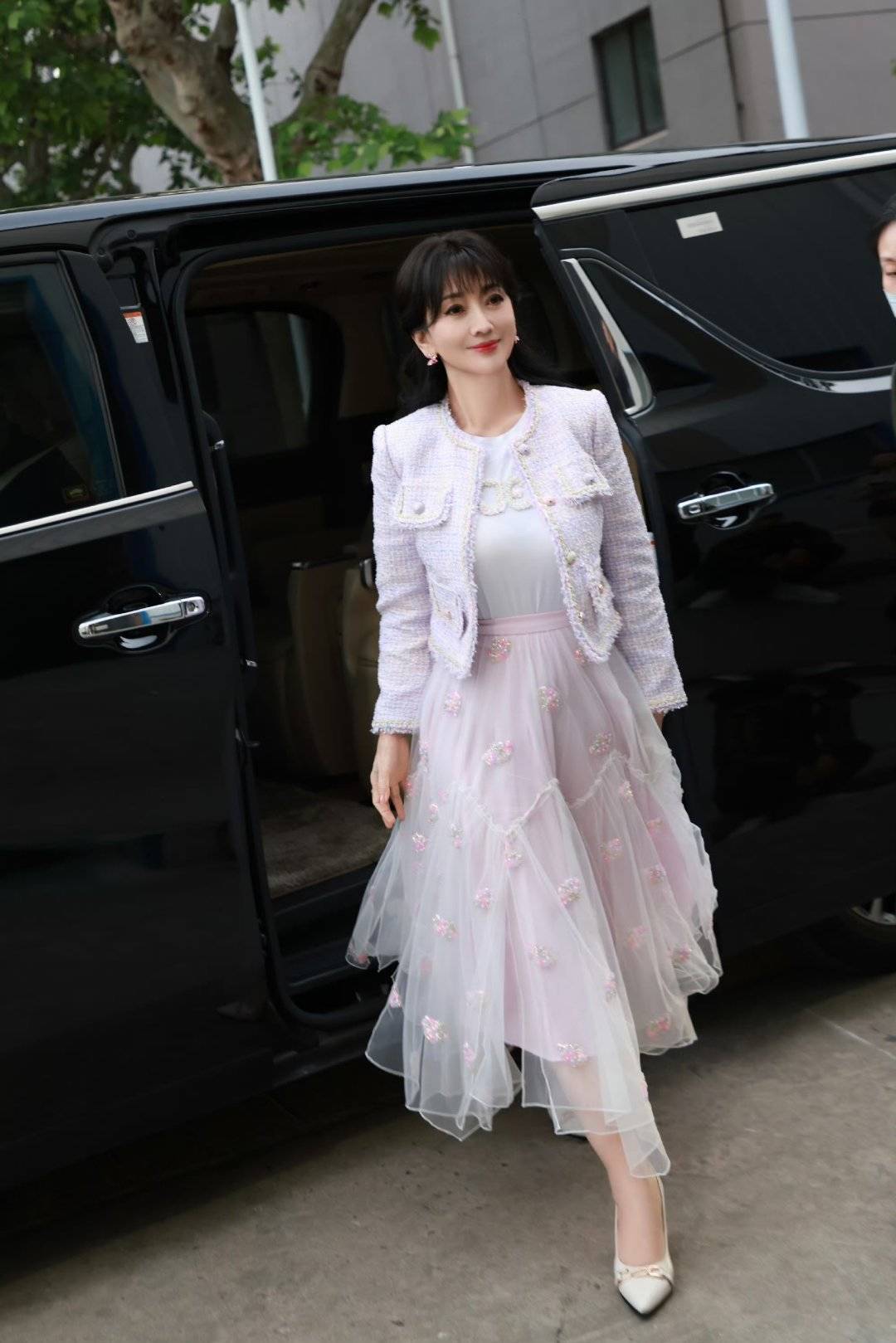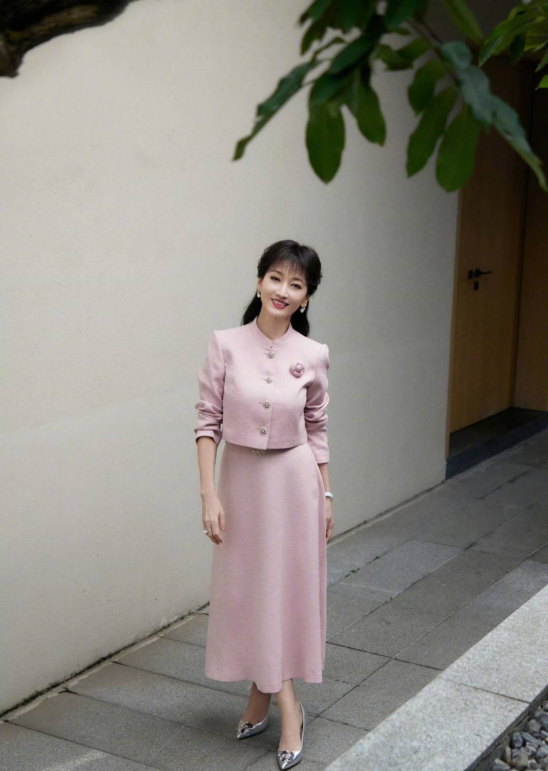 先说说最容易上手的穿搭公式。赵雅芝特别擅长用“色彩减法”藏肉显年轻。比如她那件紫色短披风拼接长裙,上半身收紧的剪裁刚好遮住拜拜肉,紫罗兰色裙身没有任何花纹,反而让整个人看起来像行走的莫兰迪油画。还有上次机场穿的粉色大衣,很多阿姨怕粉色显嫩,她却配同色系链条包和墨镜,温柔得像刚出炉的舒芙蕾。记住啊,别选全身大红大绿,低饱和度的莫兰迪色+垂坠感面料(比如醋酸、缎面),走路带风还显瘦。