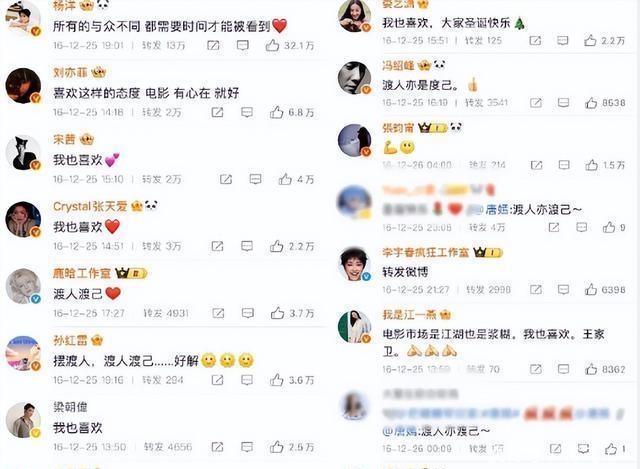 ?????? 早年间,王家卫的《摆渡人》上映后,口碑票房双扑街,他自己发文“我喜欢”,半个娱乐圈的人都跑去支持他,在评论区跟队形支持。