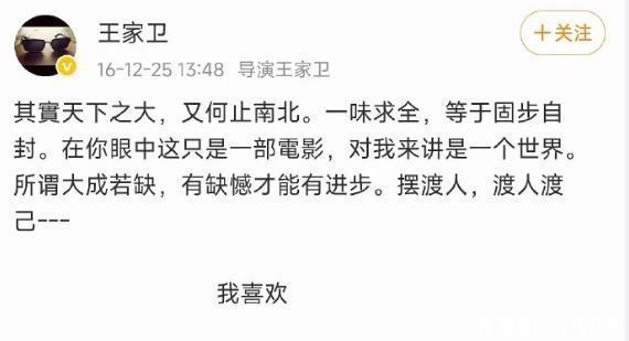 ?????? 有人劝他,这样不好,他说,不喜欢就是不喜欢,不好在哪里。?????? 如今,王家卫“跌下神坛”,大家才终于读懂王传君的那句“我不喜欢”。