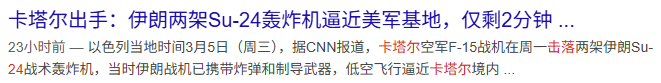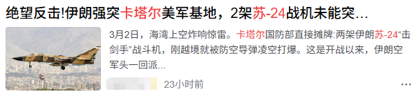 今日,卡塔尔国防部发文称,架苏-24以低空飞行(英尺高度)向美军基地冒死突击,被卡塔尔发现并击落,坠入卡塔尔领海,这也是开战以来伊朗空军战机首次出击周边区域,除了这两架被击落,还有多架在地面被毁,基本丧失大规模对地打击能力。