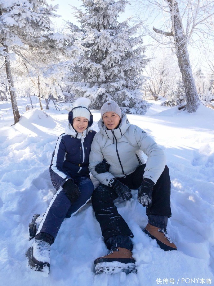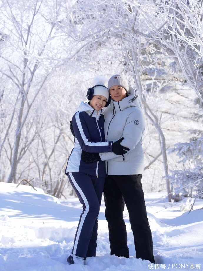 首先是一套黑白撞色滑雪服,搭配白色毛毛装饰针织帽,和黑色毛毛耳罩,同框富豪老公,两人结婚多年,出现在镜头前,依然很恩爱!
