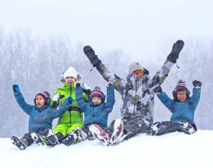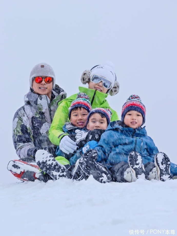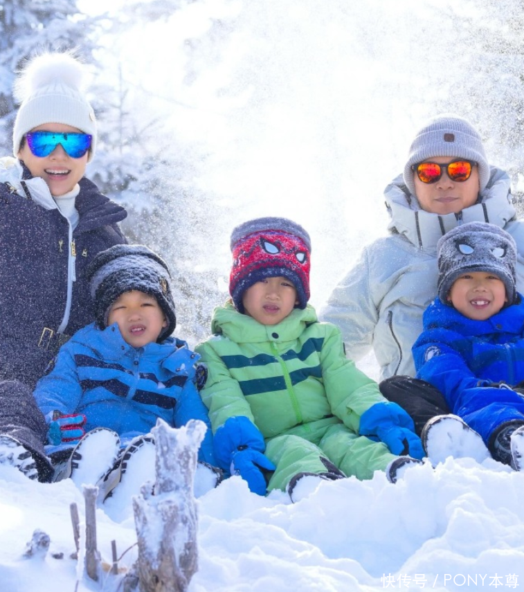 三个儿子同穿蓝色滑雪服,和自己的父母同框,活泼可爱!