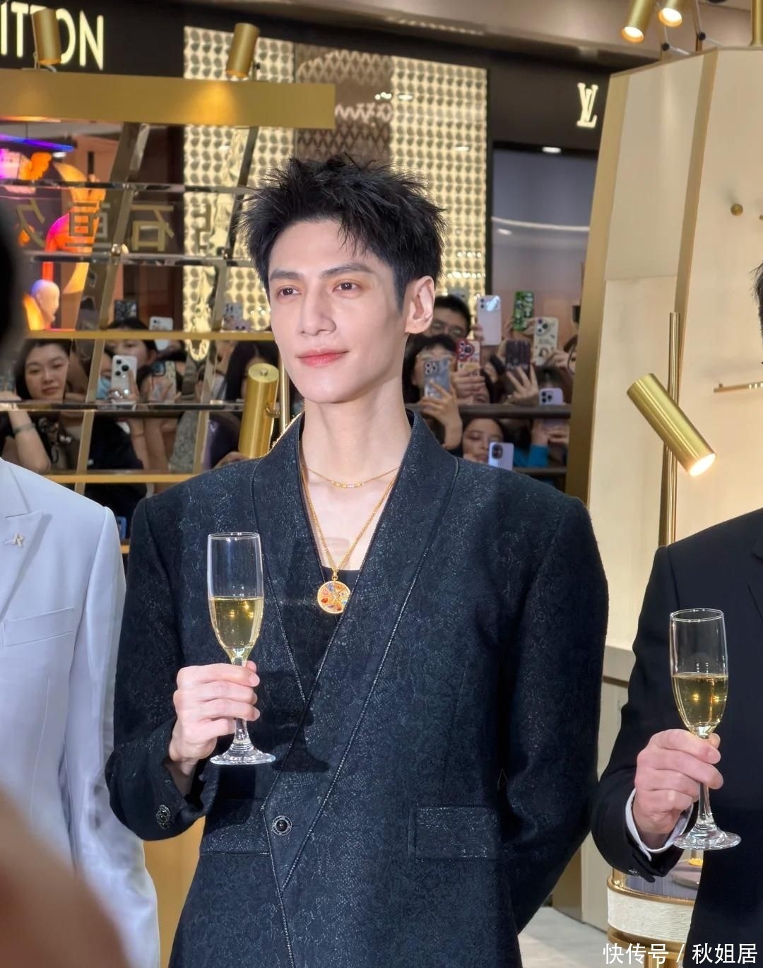 10. 一身黑色西装搭配金色吊坠,深V设计若隐若现,尽显奢华质感与成熟魅力。