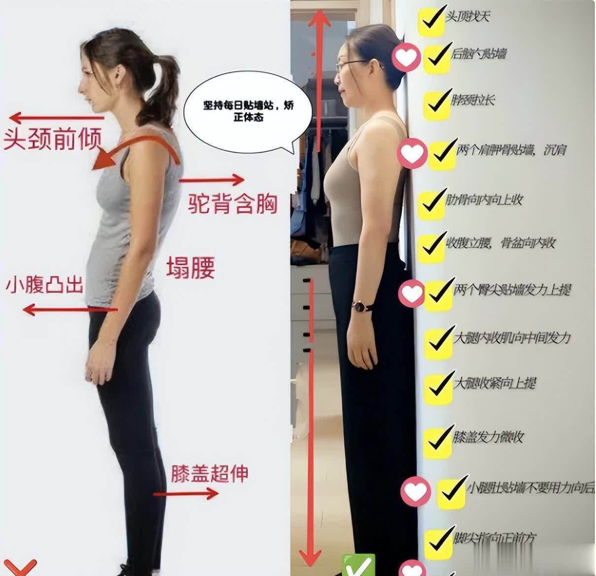 因为靠墙站的时候,后脑勺、肩膀、屁股、脚跟都得贴紧墙面,腰杆自然就挺起来了,肩膀也会不自觉地打开,不会再窝着脖子含着胸。