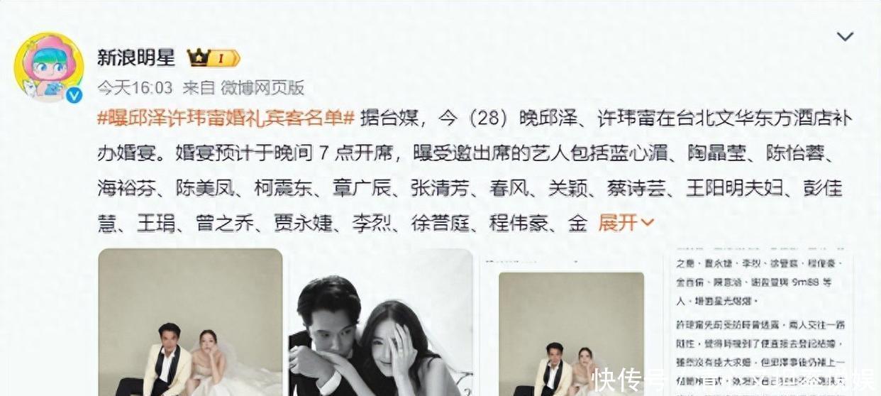 为了保持低调,传闻邱泽许玮甯夫妇包下了文华东方酒店的一整层楼,所以安保措施做得非常好,至于嘉宾也是非常强大,在这之前,就有相关的名单流出,包括陈美凤、蓝心湄、曾之乔、关颖、王阳明、彭佳慧等等。除此之外,媒体要想进入,必须依次登记,而且还要在规划动线外等候,整体来说,规模堪比三金。总的人数差不多人左右,席开则多桌,这样算下来,一桌的人数少说也人开外,不过以两人的经济实力来说,这点根本不在话下。