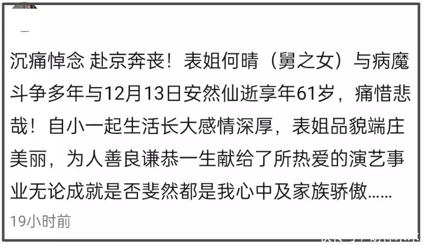 此前,何晴的表妹在社媒上沉重哀悼,表示表姐与病魔斗争多年,如今正赴京奔丧。她回忆两人的生活情谊,夸赞表姐品貌端庄,为人谦恭,一直是家族的骄傲。