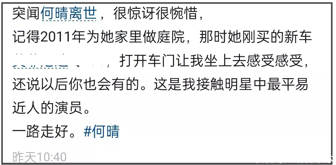 有网友晒年跟何晴的合照,表示很惋惜。他大赞何晴很平易近人,当时何晴买了新车,大方邀请他体验感受,还送他美好的祝福。