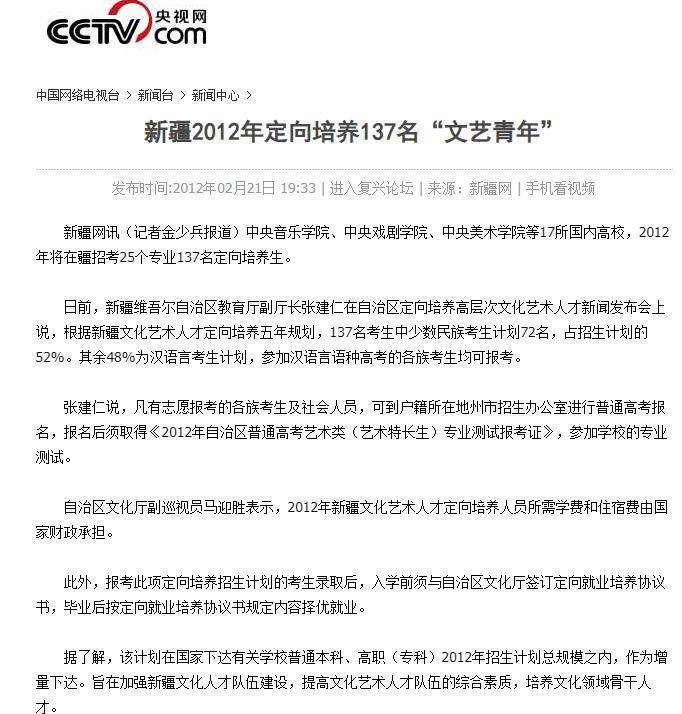 02当所有人期待中戏能够做出进一步回应时,新的猛料出现了 有吃瓜群众竟然扒出年新疆网发的一篇文章,名为“新年定向培名文艺青年” 文中清楚地显示,中央音乐学院,中央戏剧学院,中央美术学院所国内高年将在新疆招个专名定向培养生
