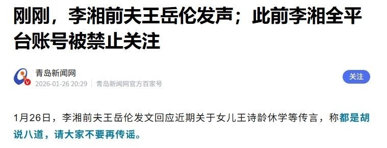 信息来源:原文登载于青岛新闻日关于“刚刚,李湘前夫王岳伦发声;此前李湘全平台账号被禁止关注”的报道