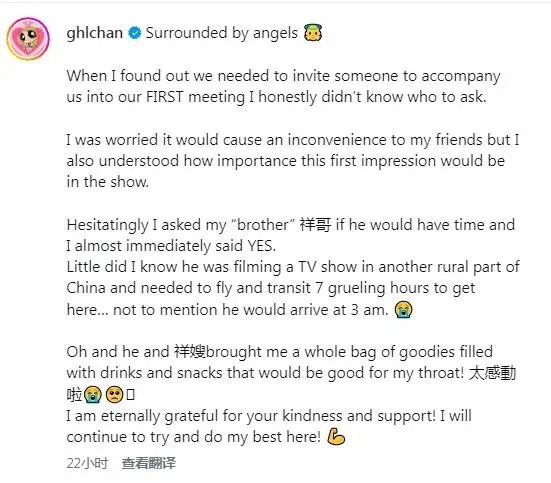 陈凯琳用英文写道:“当得知需要邀请一位朋友陪同参加初舞台时,我着实不知该找谁。我担心会给朋友增添麻烦,却也深知第一印象对节目至关重要。我犹豫良久,才询问祥哥是否有空,而他几乎立刻就应允了。我全然没想到他当时正在内地另一个偏远地区录制节目,需乘坐飞机再转机,历小时才能赶到这里……更不用说他凌点才抵达。哦对了,他和祥嫂还为我带了一大包对嗓子有益的饮品和零食!我将永远感激你们的善意与支持!我会持续努力,做到最好!”