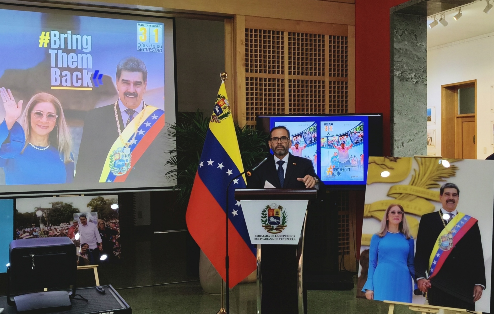 据委内瑞拉驻华使馆此前介绍,2日总统马杜罗及其夫人弗洛雷斯被绑架满一个月。使馆方面表示,此次新闻发布会及相关活动正是在这一时间节点举行,旨在就有关事态向外界阐明委内瑞拉政府的立场。
