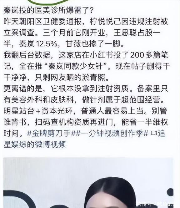 当然了,也有人说,这时候把秦岚的感情事儿爆出来,是为了转移视线,掩盖她医美公司出问题的事儿。那家公司是她和甘薇、王思聪一起开的。王思聪大家都熟,甘薇的前夫就是那个跑到美国至今没回来的贾跃亭,这几个人凑一块儿开公司,不出事才怪呢。