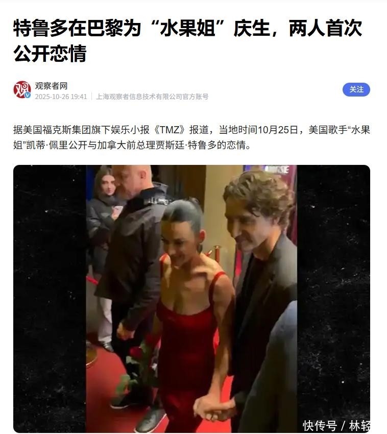 岁的“水果姐”凯蒂·佩里岁的加拿大前总理贾斯汀·特鲁多被拍到在巴黎夜晚并肩行走、手牵手穿过灯火阑珊的街道时,这段持续数月的绯闻恋情终于以最自然又最震撼的方式浮出水面。