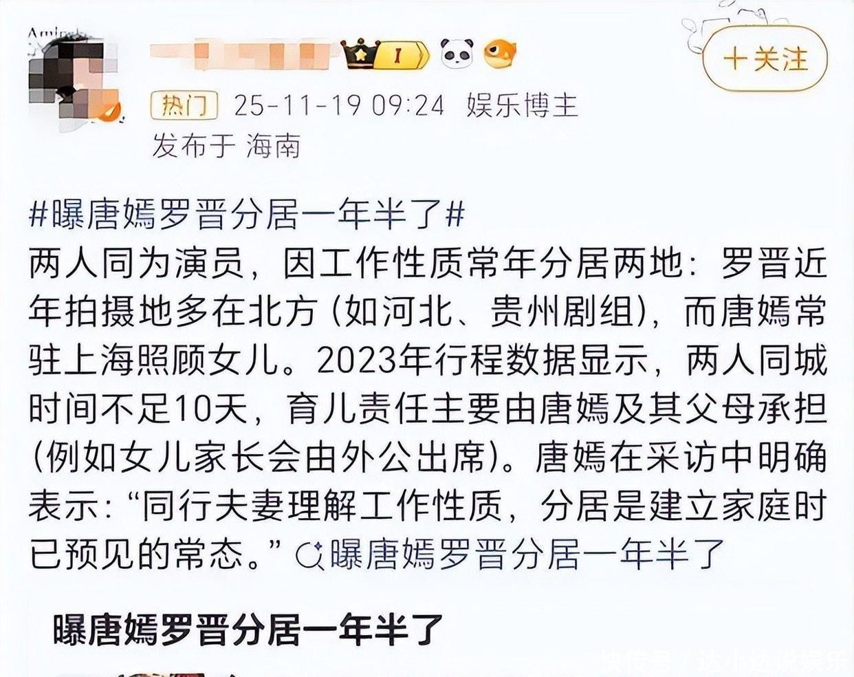 人一旦出名,麻烦事儿就多,这话放在唐嫣身上再贴切不过了。这不,又有消息说唐嫣和罗晋“分开住”有一阵子了,现在两人的婚姻快走到头了。有眼尖的网友发现了以下情况:2023月首次传出两人分居消息,同时北京的温馨小窝也挂上了售卖牌。2023月,唐嫣携女儿返回上海,和她的爸妈一起生活,据说这样外公外婆接送孩子更方便;2024月罗晋过生日时,两人在微博上没有任何互动。2024月,“晋嫣影视”有三成股份已转手。